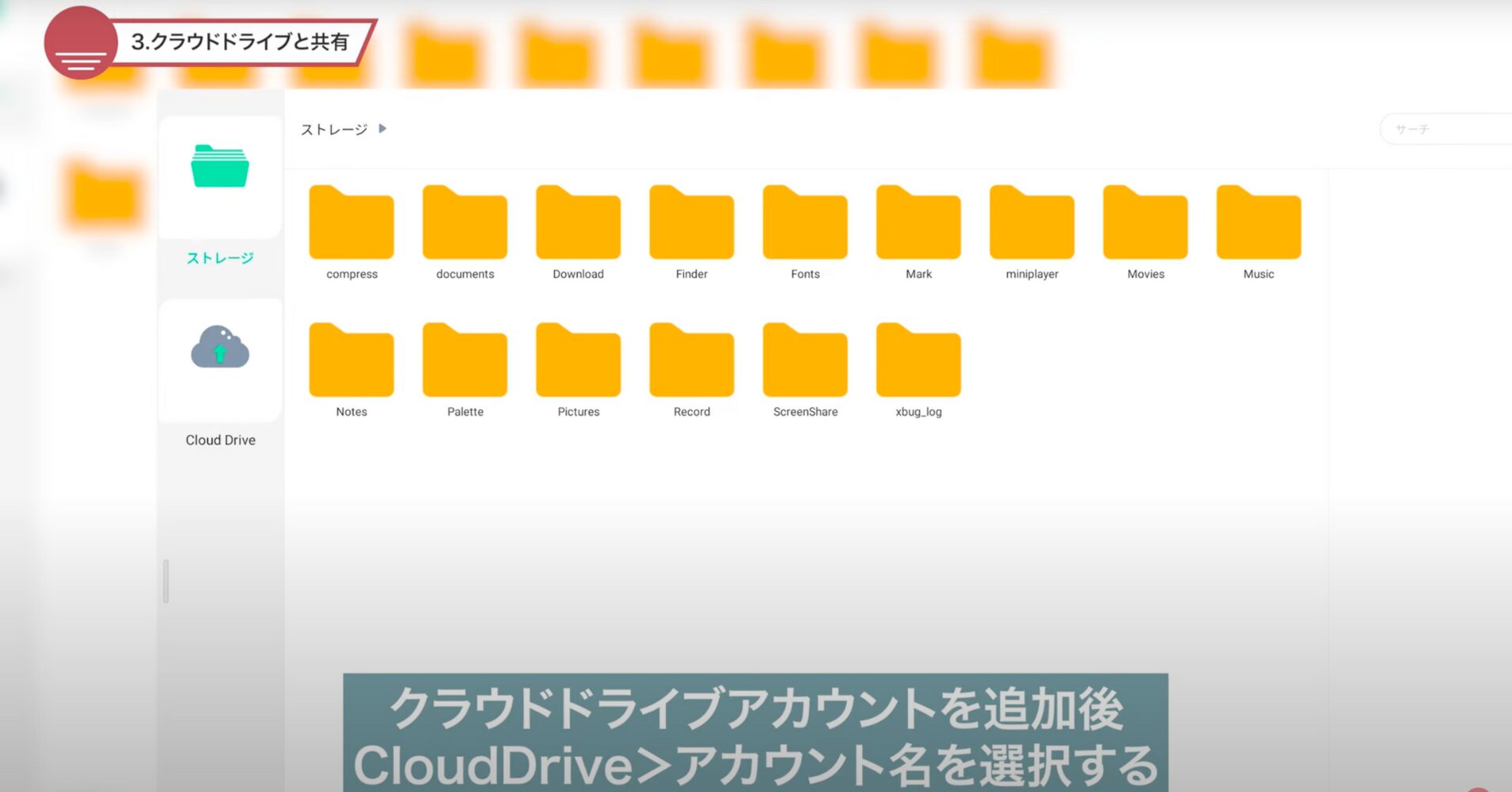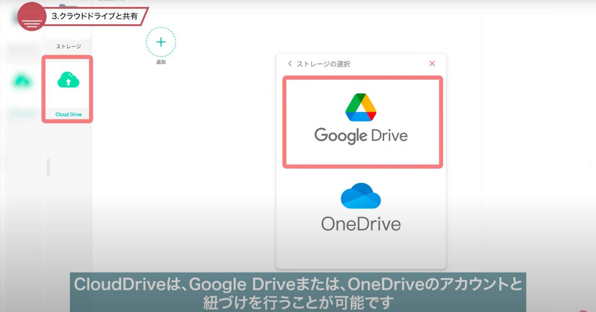 本体ストレージのファイルをクラウドドライブに共有すれば、複数人で一つの資料を編集・共有できるので便利です。