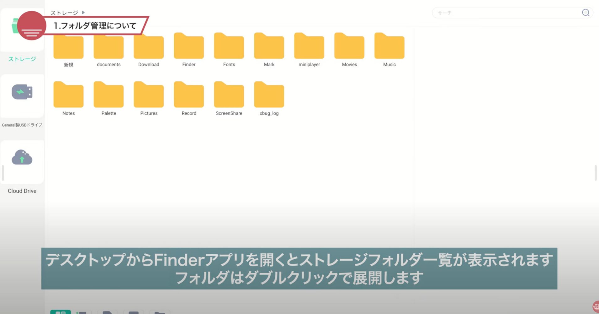 内蔵ストレージや接続された外部デバイスのフォルダ一覧が表示されます。