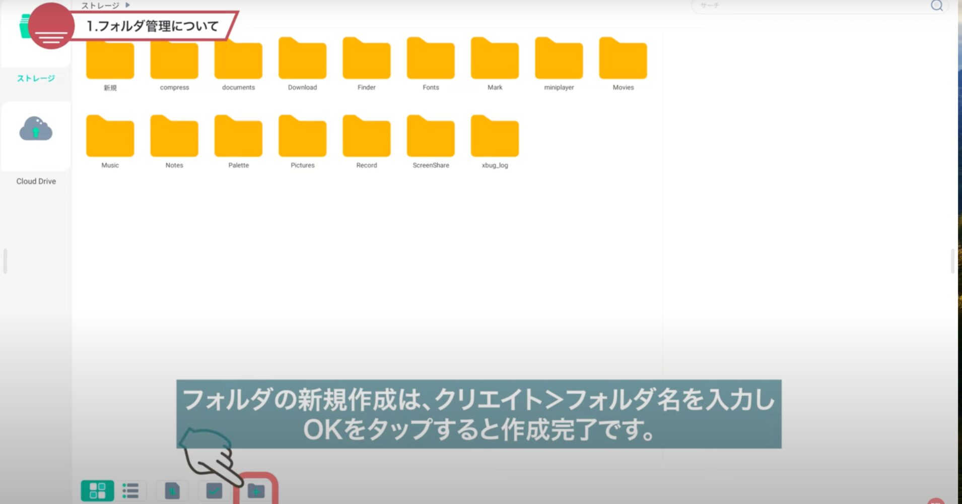 新しいフォルダを作る時は、画面上の「クリエイト」をタップします。作ったフォルダは、ダブルクリックすることで中身を開きます。