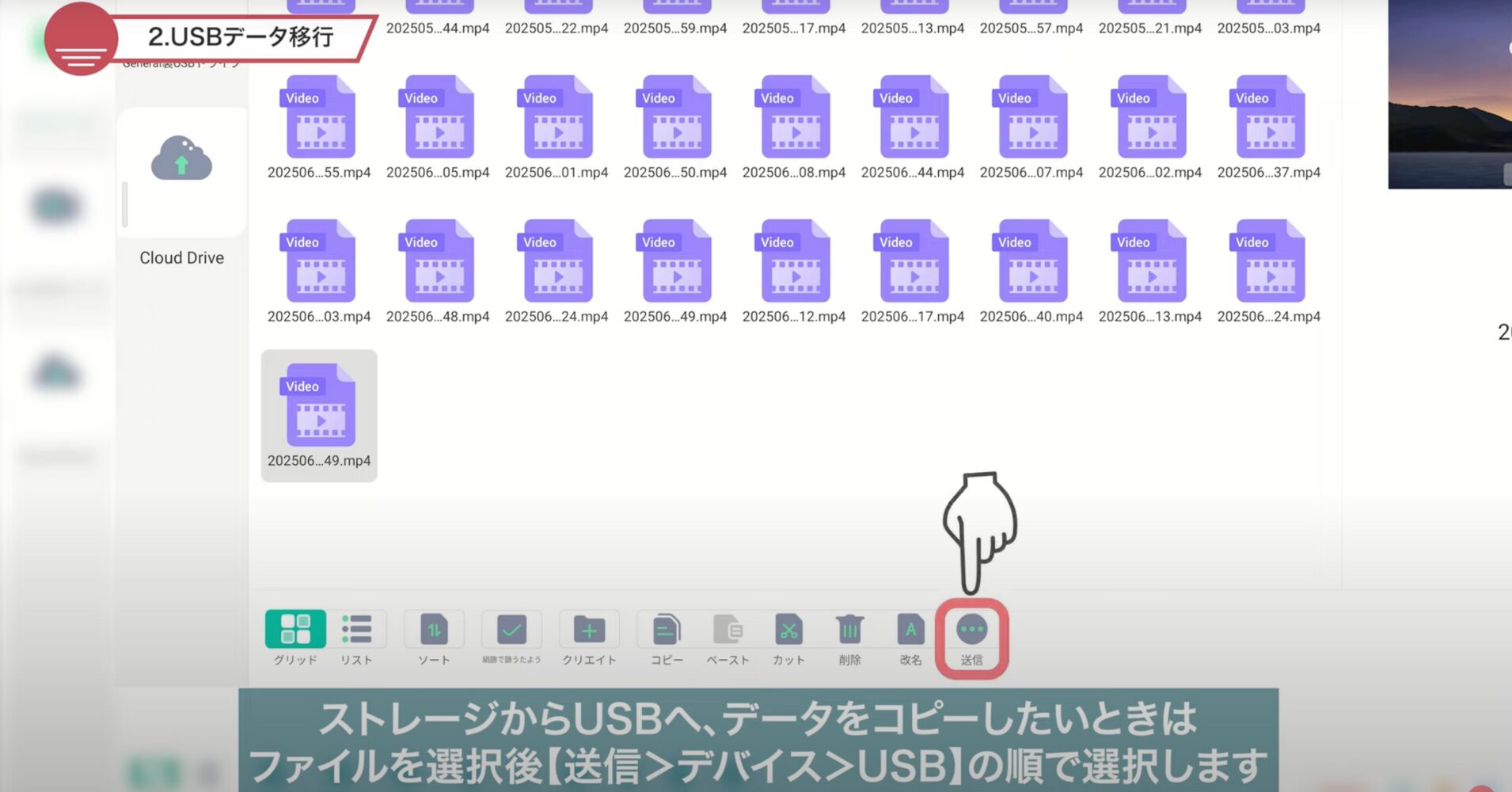 授業や会議で作成した板書データなどを、本体からUSBへ簡単にコピーできます。ファイルを選択後、「送信」>「デバイス」>「USB」の順でタップするだけです。